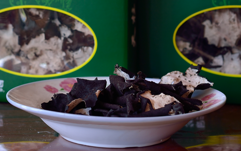 屬地衣門石耳科,菌體葉狀,正面為灰白或灰綠色,反面為黑褐色,多生長于海拔700-2000米懸崖峭壁的陰濕石縫間。石耳常以小群落的形式分布,少則幾片,多則百余片。一公斤干石耳約1400片左右,因而極其珍貴。石耳的藥用價值很高,《神農(nóng)本草經(jīng)》就把它列為上等藥材。其主要成份有氨基酸、卵磷質(zhì)和多種微金屬元素。有滋陰潤肺、治療高血壓和各種熱癥等攻效,對抑制腫瘤、出血也有積極作用。同時石耳亦可佐菜食用?!笆鸁跫佐~”、“石耳烏雞湯”等乃為上等佳肴。天柱山地處江淮之間,氣候溫和、雨量充沛,終年云霧繚繞,且境內(nèi)群山環(huán)繞,海拔千米以上的雄峰45座,是石耳生長的理想之地。