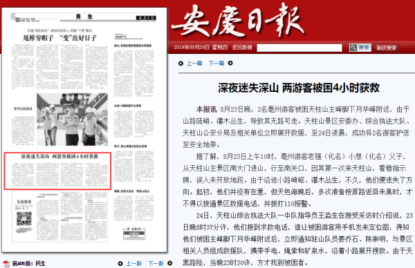 24日,天柱山綜合執(zhí)法大隊(duì)一中隊(duì)指導(dǎo)員王淼生在接受采訪時(shí)介紹說(shuō),23日晚8時(shí)37分許,他們接到求救電話,遂讓被困游客用手機(jī)發(fā)來(lái)定位圖,得知他們被困主峰腳下月華峰附近后,立即通知駐山隊(duì)員姜喬石、陳崇明,與景區(qū)相關(guān)人員組成救援隊(duì),攜帶手電、繩索和礦泉水,沿著小路展開(kāi)搜救。由于天黑路險(xiǎn),當(dāng)晚23時(shí)30許,方才找到被困者。